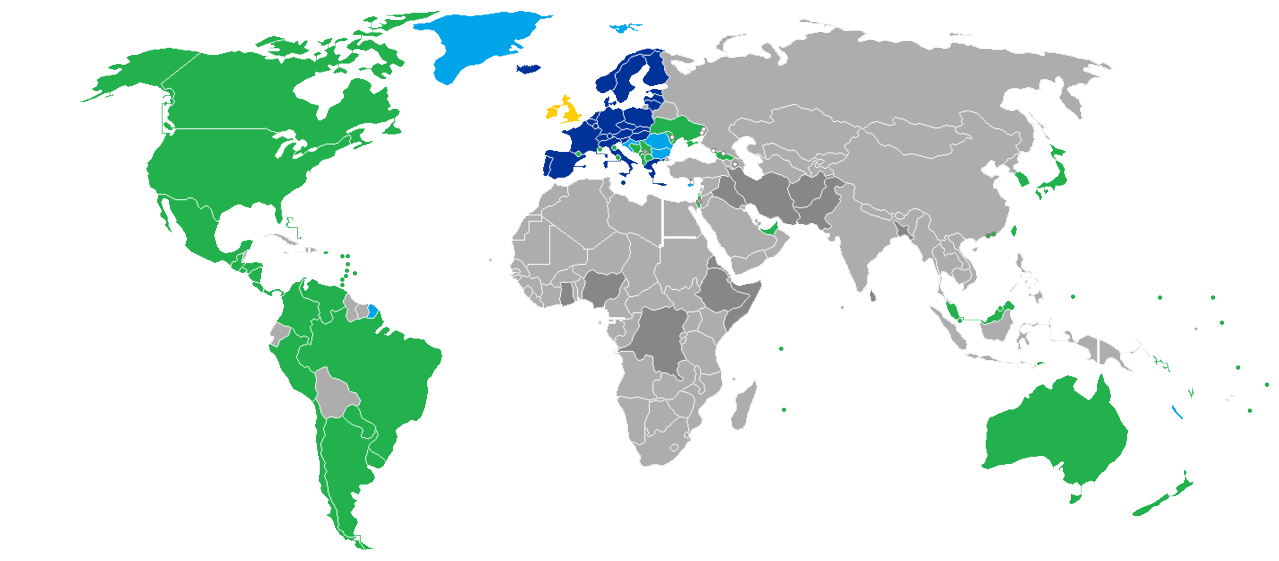 The Schengen Area includes 22 of the 28 EU countries, and entitles citizens of participating nations to travel freely between them. It also includes a few non-EU nations: Iceland, Norway, Switzerland and Liechtenstein. The area operates as a single nation with a uniform visa policy for purposes of international travel.